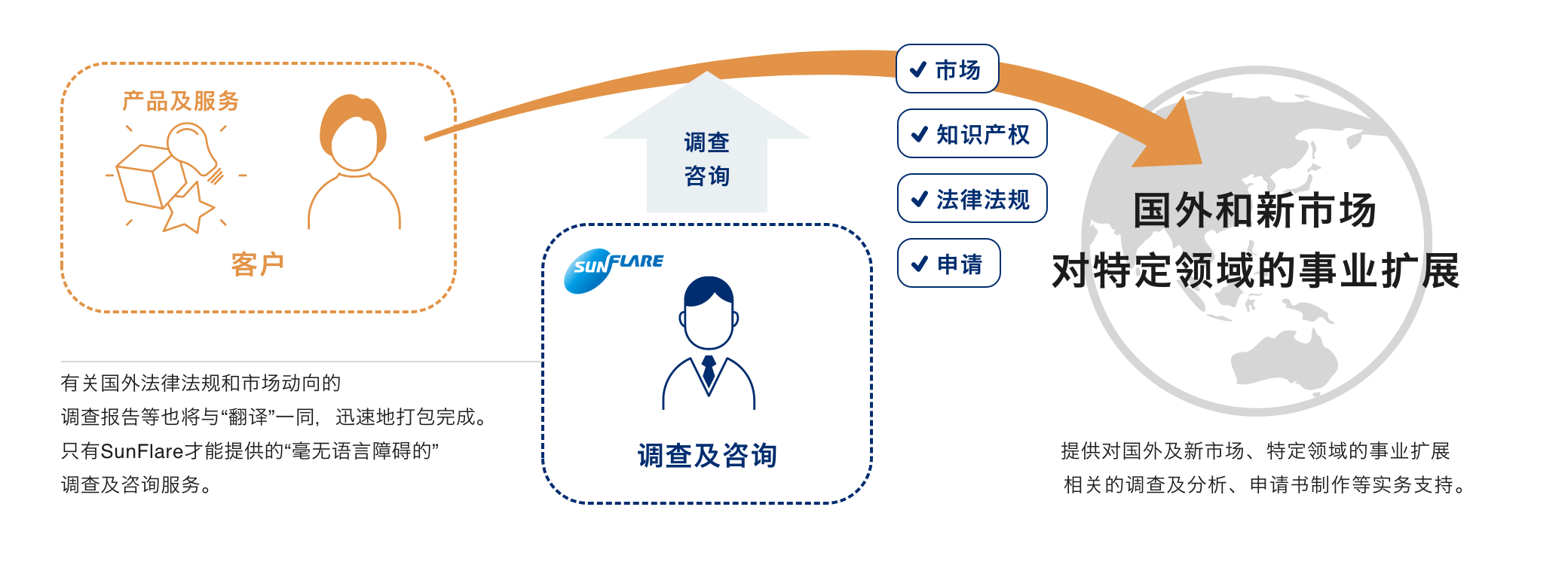 专注于客户的行业、行业类别的SunFlare的调查员及顾问提供知识产权战略及国外市场进入、新市场进入等调查及咨询服务,以实现客户事业的成功。