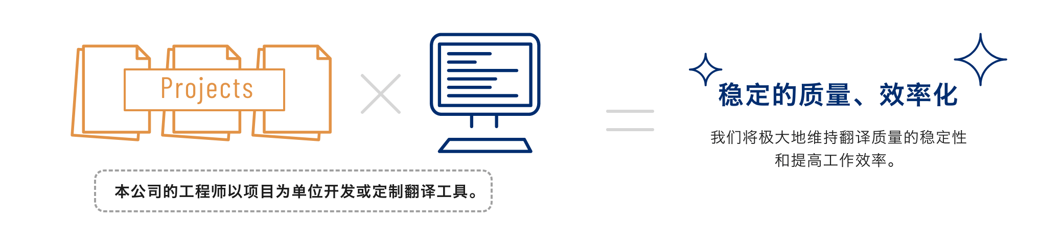 为了有效地实施质量稳定的翻译,本公司的工程师开发了独有的翻译工具。通过利用翻译工具在保障质量的同时,还能实现快速翻译,在所有项目中都将满足客户的需求。