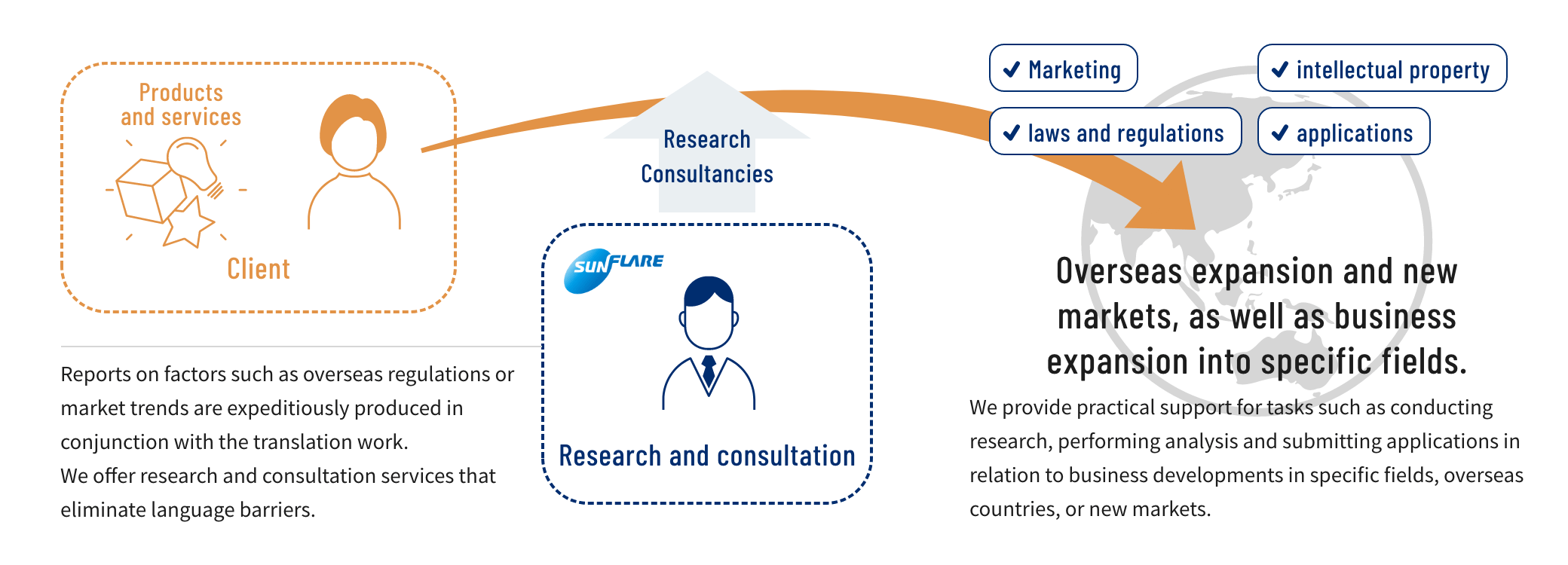 To help our clients develop their businesses, we employ specialists in the relevant industry or field to carry out searches and provide consultation services in areas such as intellectual property strategies, overseas expansion, and new market entry.