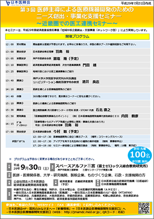 | 【参加者】 | 医療機器開発のニーズをお持ちの医師・医療関係者、大学・研究機関、医療機器メーカー、行政・支援機関等 |