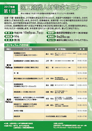 株式会社サン・フレアのリサーチ&コンサルティング部門は、 2017年10月6日(金)に公益財団法人 神戸国際医療交流財団様主催の第1回医工連携人材育成セミナーににて、「医療機器のQMS-日本のQMS基準とISO13485-」のテーマで講演を行いました。