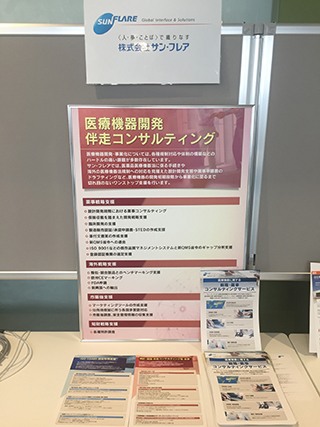 サン・フレアでは、医療機器分野における国内及び海外薬事コンサルティングサービスを提供しており、ブースでは、「国内医療機器 届出・認証・承認申請支援」「ISO 13485承認取得支援」「欧州CEマーキング取得支援」「医療機器業界新規参入支援」「法規制・規格調査」の5つのテーマを中心としたサービスのご案内とご要望に応じた無料相談会を開催いたしました。