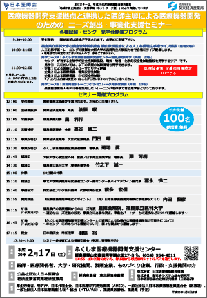 | 【名称】 | 医療機器開発支援拠点と連携した医師主導による医療機器開発のためのニーズ創出・事業化支援セミナー 併設展示会 |