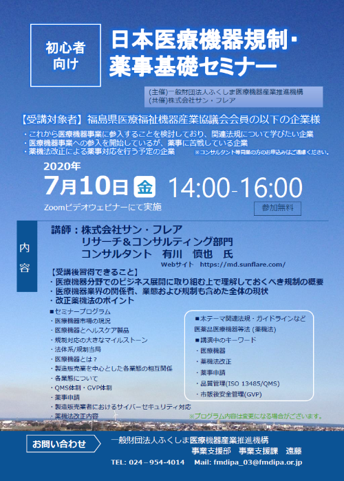 株式会社サン・フレアのリサーチ&コンサルティング部門は、2020年7月10日(金)、ふくしま医療機器産業推進機構様との共催セミナー「初心者向け日本医療機器規制・薬事基礎セミナー」にて講演を行いました。
