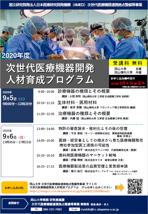 2020年9月6日(日)岡山大学様主催・岡山理科大学様共催の2020年度「次世代医療機器開発人材育成プログラム」にて、「医療機器製造業の品質管理と業登録申請」と題して講演いたしました。