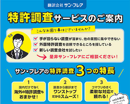 株式会社サン・フレア お客様サービス本部Tel:03-3355-1168 Mail: sf-patent@sunflare.co.jp